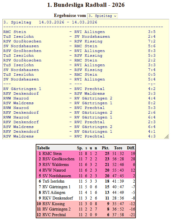 Mit sieben Punkten aus vier Spielen sammelten Timo Wagner und Pascal van Klev eine gute Ausbeute und verbesserten sich zur Halbzeit der Saison um einen Platz auf Tabellenrang 4. Der Rückrundenstart der 2. Bundesliga Staffel Mitte geht am am 25. April 2026 beim RSV Kemnat über die Bühne. Dort wollen die Nauroder Radballer an ihre Leistung aus Waldrems anknüpfen und weitere wichtige Punkte im Kampf um die oberen Tabellenplätze sammeln.