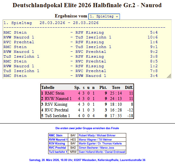 Mit insgesamt neun Punkten standen nun neben dem Naurod die Teams aus Stein und Kissing punktgleich an der Tabellenspitze und hier sollte nun das Torverhältnis entscheiden. Neben dem Gruppenersten aus Stein konnten sich Wagner/ Wehner knapp vor Kissing platzieren und sich mit dem zweiten Platz das Finalticket sichern.
