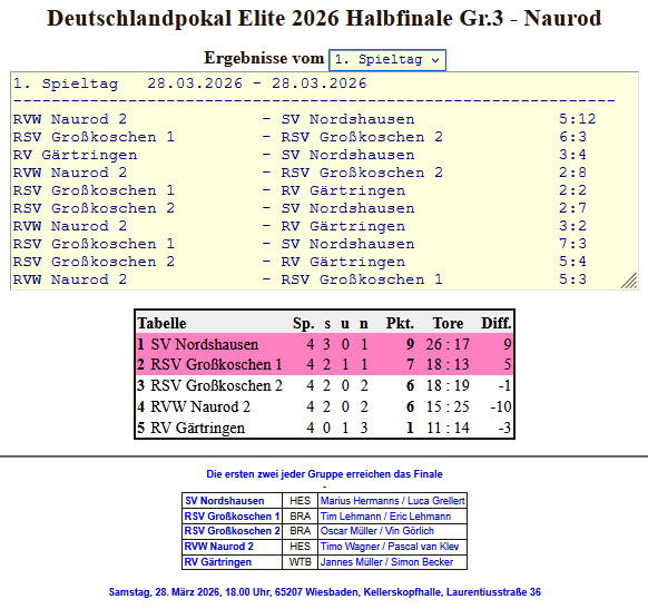 Am Ende belegten Wagner/ van Klev mit sechs Punkten, punktgleich mit Großkoschen II, jedoch mit dem schlechteren Torverhältnis, den vierten Platz und verpasste damit knapp die Qualifikation zum Finale des Deutschlandpokals. Nordshausen und Großkoschen I sicherten sich die Finalteilnahme beim Deutschland-Pokal- Finale, welches am 16. Mai 2026 in Wallbach/ Bad Säckingen nahe der Schweizer Grenze stattfindet.