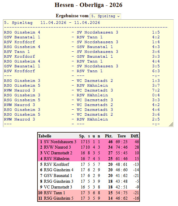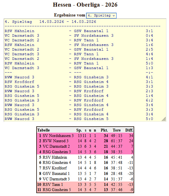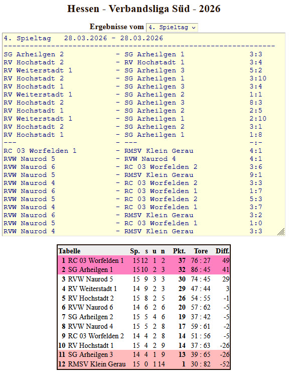 Für Naurod IV gingen Lars Henning und Ersatzspieler Kevin Ruf an den Start, da Nico Webel an diesem Spieltag berufsbedingt verhindert war. Das Team musste sich zunächst im vereinsinternen Duell Naurod V mit 1:4 geschlagen geben. Es folgte ein 3:3-Unentschieden gegen Worfelden II. Gegen Tabellenführer Worfelden I musste man ein 3:7 quittieren, ehe im letzten Spiel gegen Klein-Gerau erneut ein 3:3-Remis erzielt wurde. Mit 2 von 12 Punkten fiel Naurod IV in der Tabelle um einen Platz zurück und belegt nun Rang acht. Der fünfte Spieltag der Verbandsliga Süd findet am 25. April 2026 in Hochstadt statt.