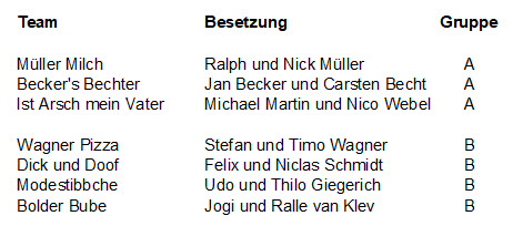 In den Gruppen A und B wurden wieder zum Teil sehr mutige und sehenswerte Spielzüge geboten. In der Finalrunde wurden die Platzierungsspiele und Halbfinals ausgespielt. Im Spiel um Platz 5 gewann die Mischung aus Wagner Pizza und Modestibbche gegen Becker’s Bechter mit 6:2, während im Spiel um Platz 3 die Bolder Bube gegen Müllermilch die Oberhand behalten konnten. Im Finale standen sich Onkel Niklas und Felix Schmidt sowie Michael Martin und Nico Webel gegenüber und hier konnten Dick und Doof den Sieg einfahren und den Pokal mit nach Hause nehmen – Herzlichen Glückwunsch ! Vielen Dank an dieser Stelle an Ralph Müller für die gewohnt gute Organisation dieses Turniers.