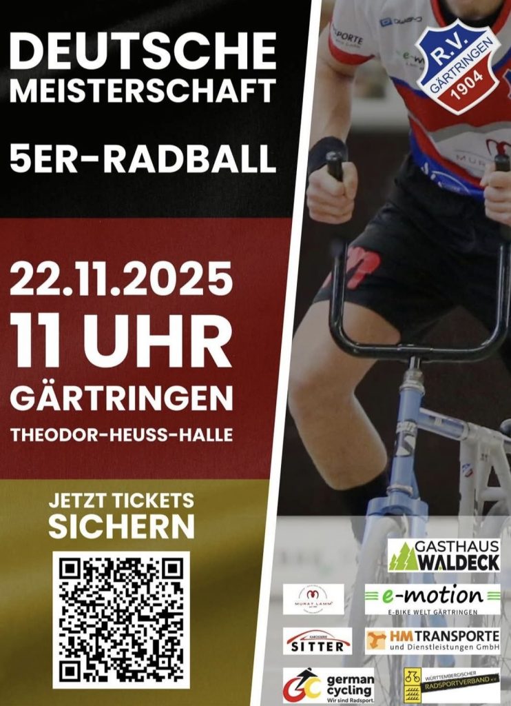 wir möchten euch herzlich einladen, uns zur Deutschen Meisterschaft im 5er Radball zu begleiten und unser Team in Gärtringen lautstark zu unterstützen! Dieses spannende Event findet am Samstag, den 22. November 2025 (Beginn 11 Uhr) statt und für diesen Wettkampftag ist eine gemeinsame Busfahrt geplant.